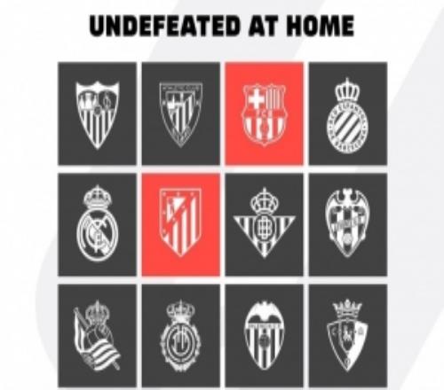 本赛季至今仅两队西甲主场仍不败:巴萨9战全胜、马竞8胜1平
