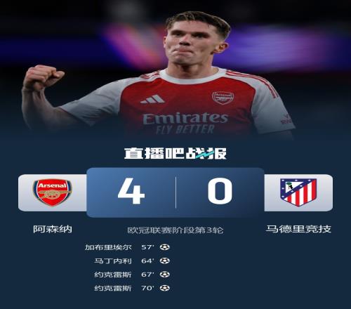 体育播报10月22日宣 马竞本轮0-4遭阿森纳横扫,西蒙尼在第63分钟做了一次连换3人的调整,巴埃纳、加拉格尔、鲁杰里上场,换下吉梅内斯、冈萨雷斯和科克。