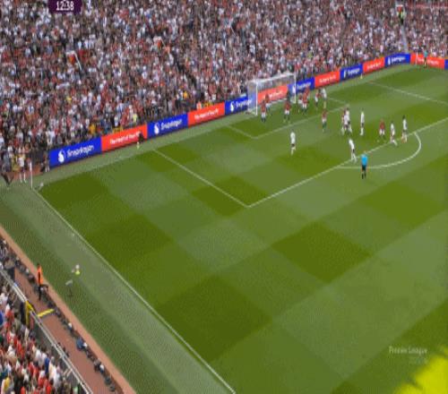 收获了这样的进球之后,曼联的士气在主场彻底被引爆,球员的表现更加上头,这个时候的姆贝乌莫才输出了他在本场比赛的第一次真正意义上的对抗,为身后的布鲁诺制造了转移到弱侧的空间: